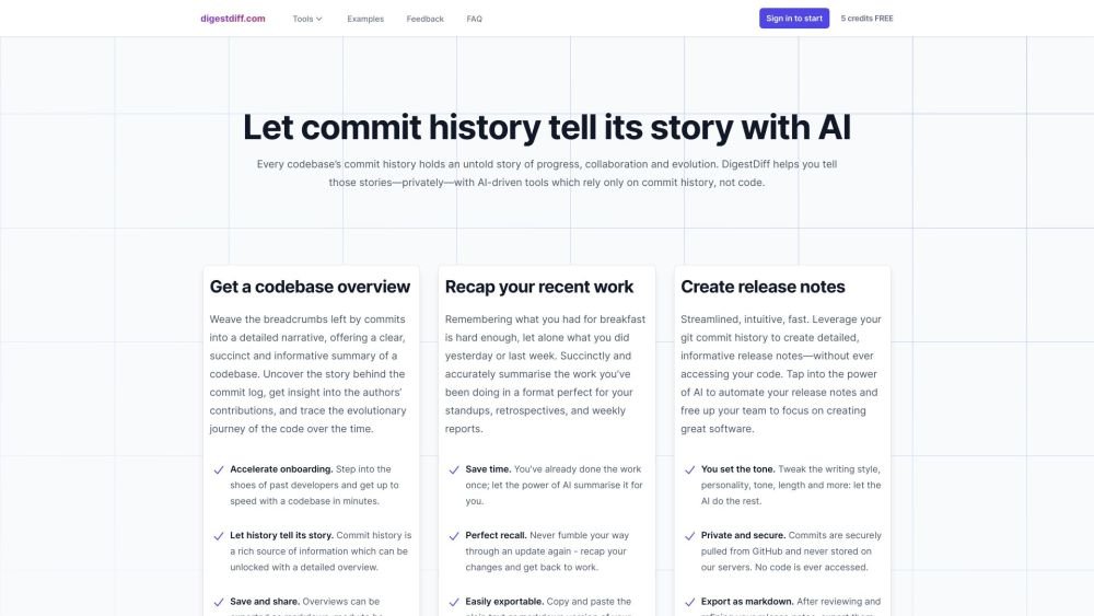 DigestDiff uses AI to analyze commit history for codebase insights and release notes.